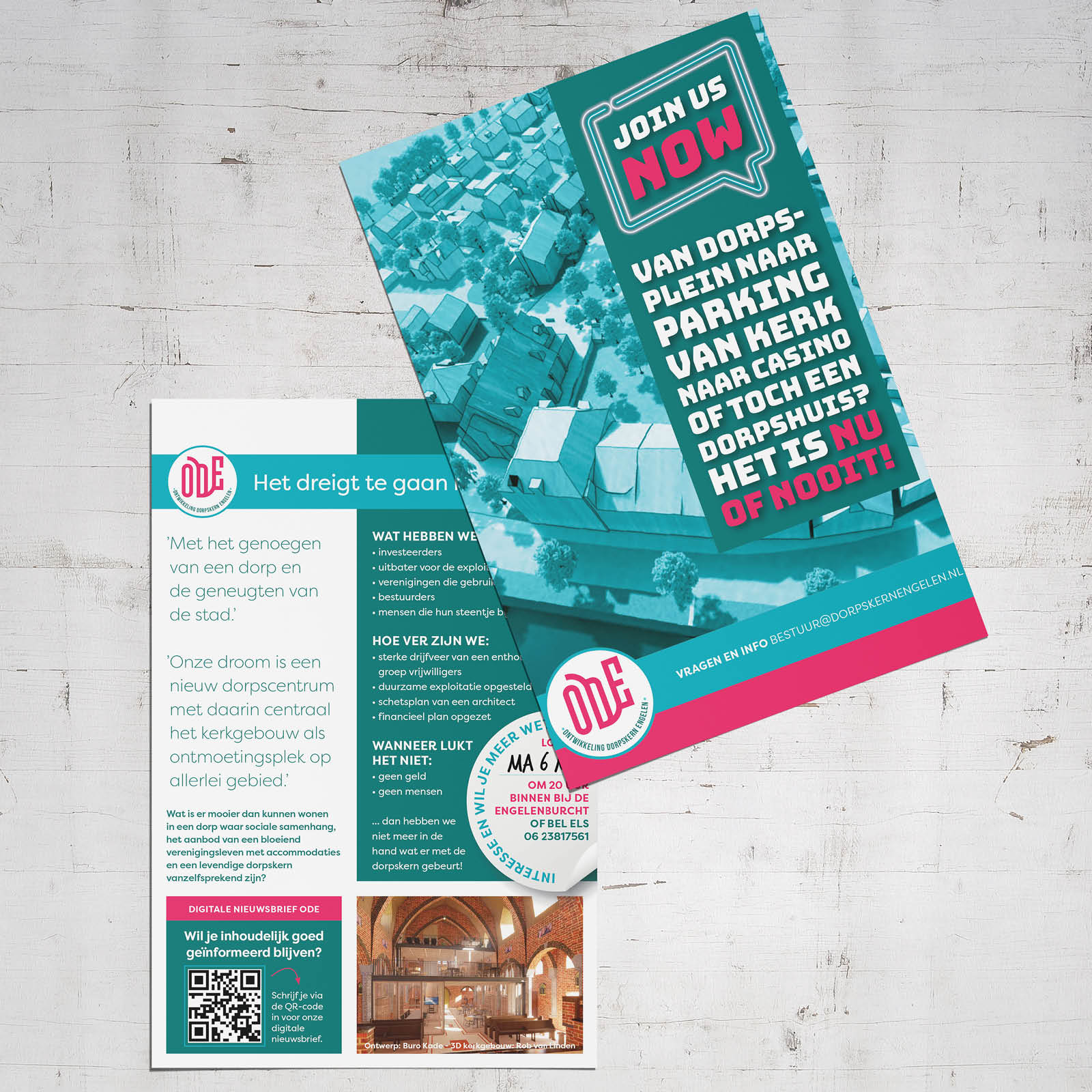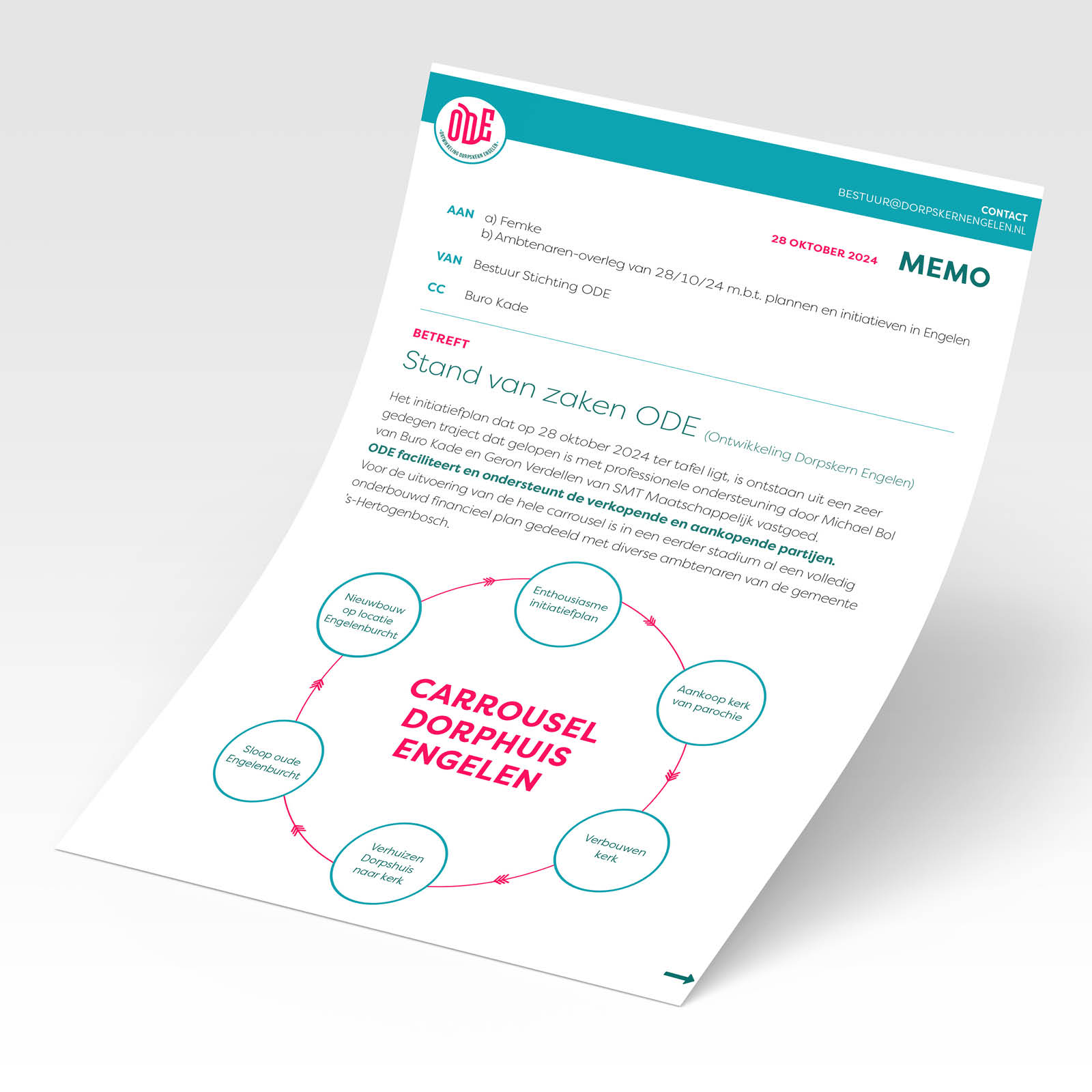 Stichting Ontwikkeling Dorpskern Engelen (ODE) is een inwonersinitiatief die zich inzet voor de herontwikkeling van de oude dorpskern (in het gebied van frietzaak tot begraafplaats) waarbij we de realisatie van een nieuw uitnodigend dorpshuis in de St. Lambertuskerk als hoogste ambitie hebben. In het kader van vrijwilligerswerk ben ik daar de kartrekken van de creatieve denktank.